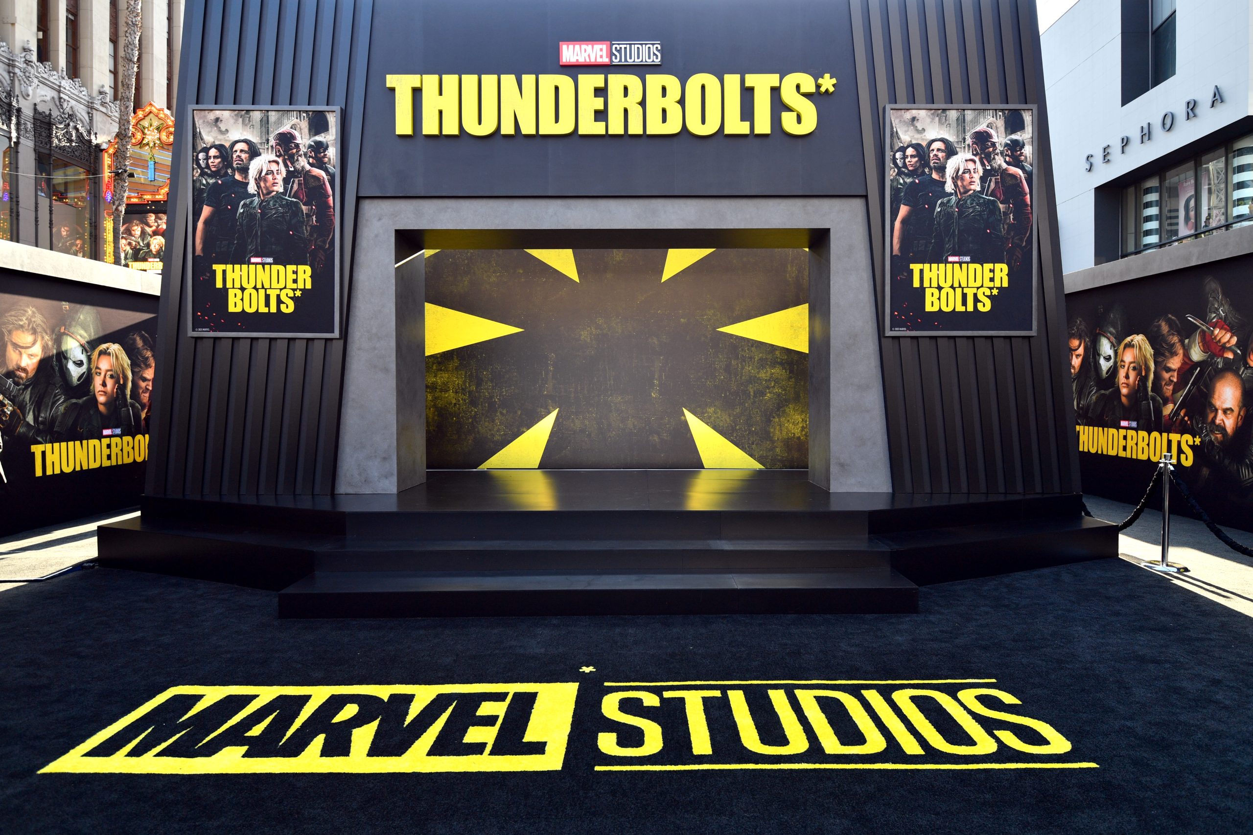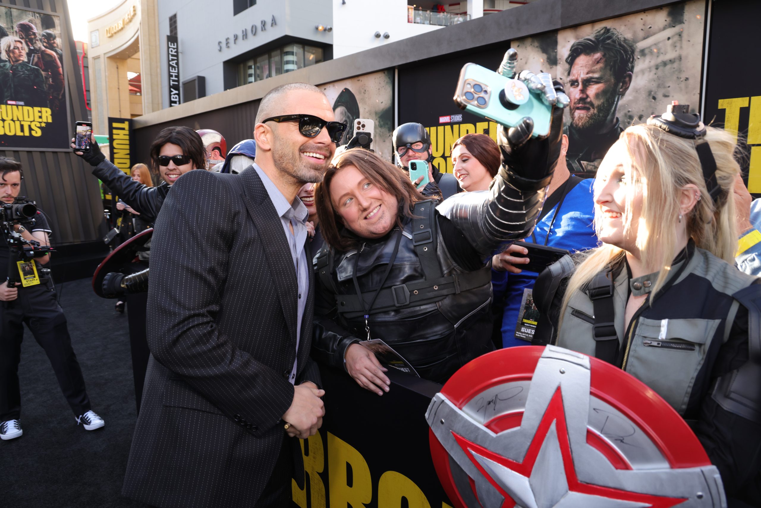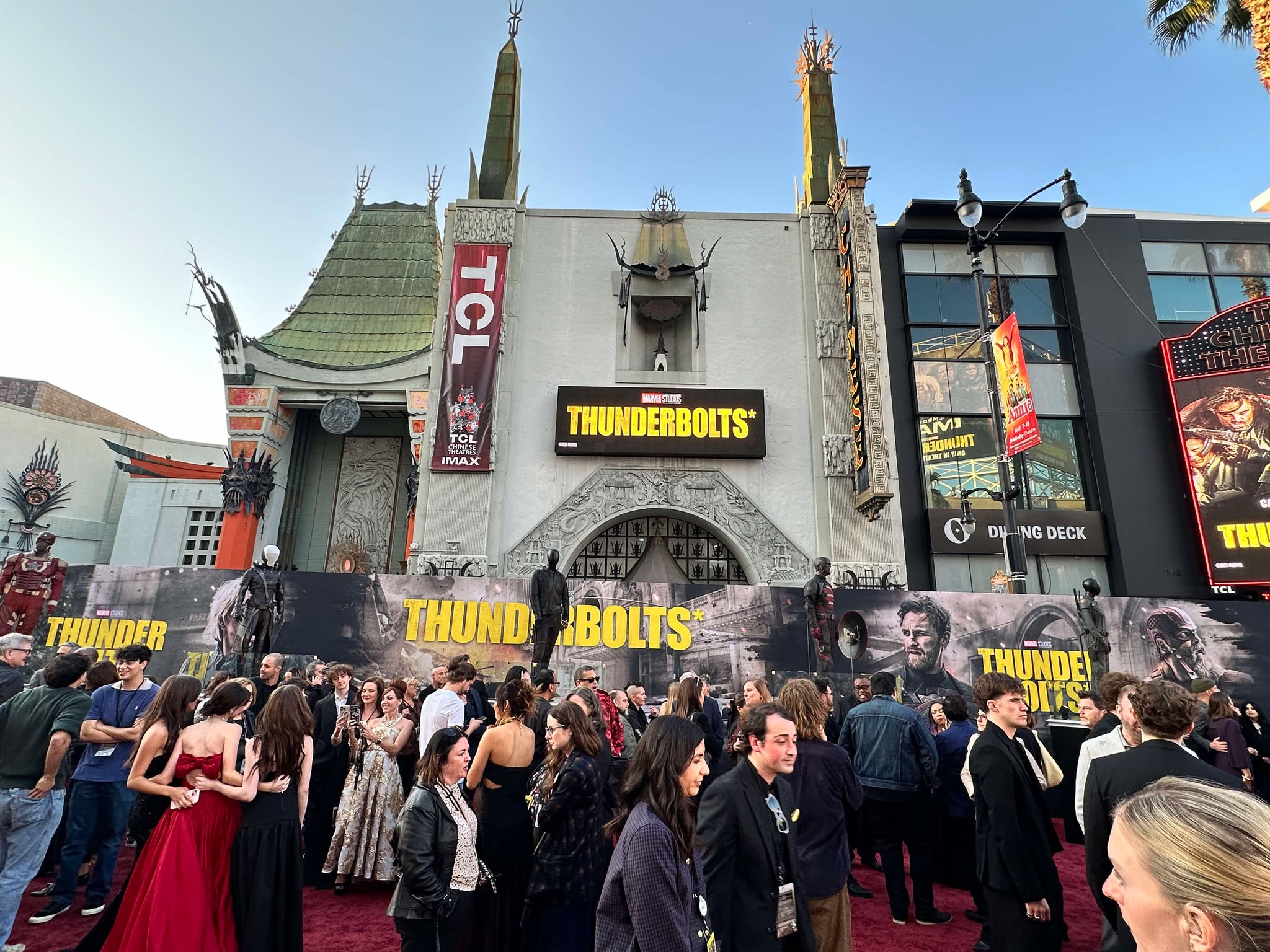 Before the red carpet even began, the energy on Hollywood Boulevard was palpable. Fans lined the streets hours ahead of showtime, some in full cosplay, all eager for a glimpse of the Marvel stars. We soaked in the vibrant buzz surrounding the event and got our first look at the larger-than-life Thunderbolts* branding wrapped around the theatre entrance.