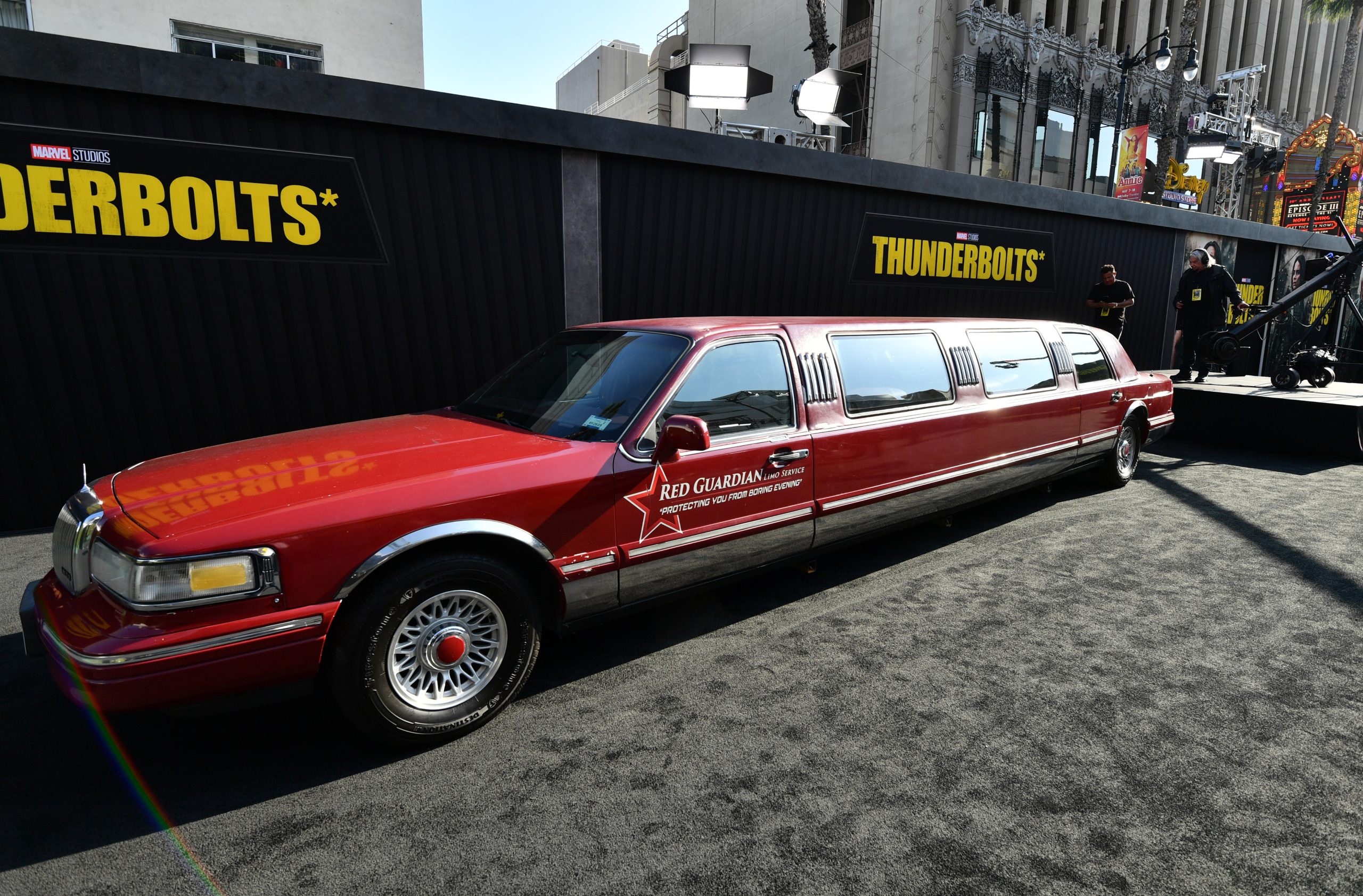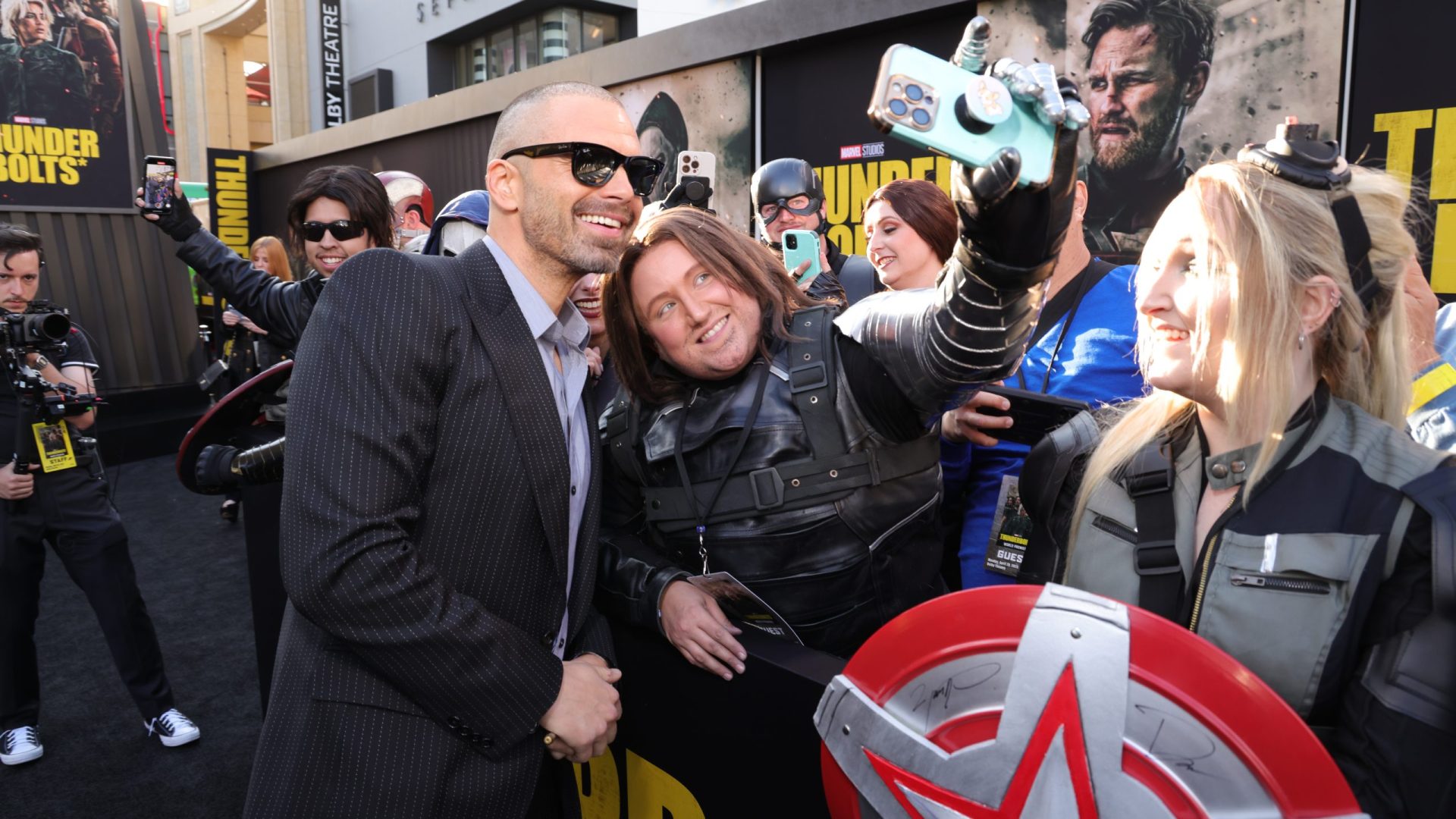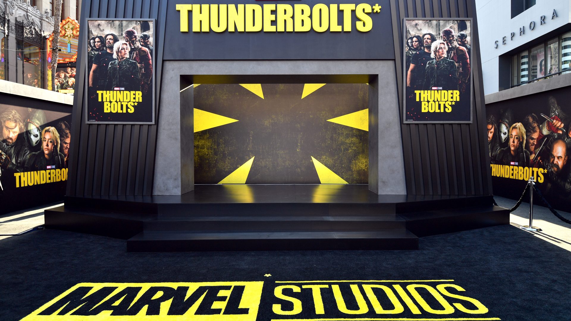 Before the red carpet even began, the energy on Hollywood Boulevard was palpable. Fans lined the streets hours ahead of showtime, some in full cosplay, all eager for a glimpse of the Marvel stars. We soaked in the vibrant buzz surrounding the event and got our first look at the larger-than-life Thunderbolts* branding wrapped around the theatre entrance.