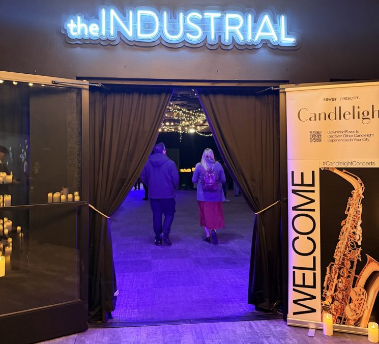The INDUSTRIAL Event Space is a perfect venue for this affair. You walk in the doors and the vibe is immediately intimate. Candles (non-flame) are set up pretty much all through the space providing a lot of the light. Two strategically placed bars to grab a cocktail or wine before you walk in. The seating is split between Zone A, in the front, and Zone B in the back, with no assigned seats. An usher guides people to their seats; it all feels very organized and comfortable. To keep the mood dark and atmospheric, the audience was told to keep their phones away until the final song.