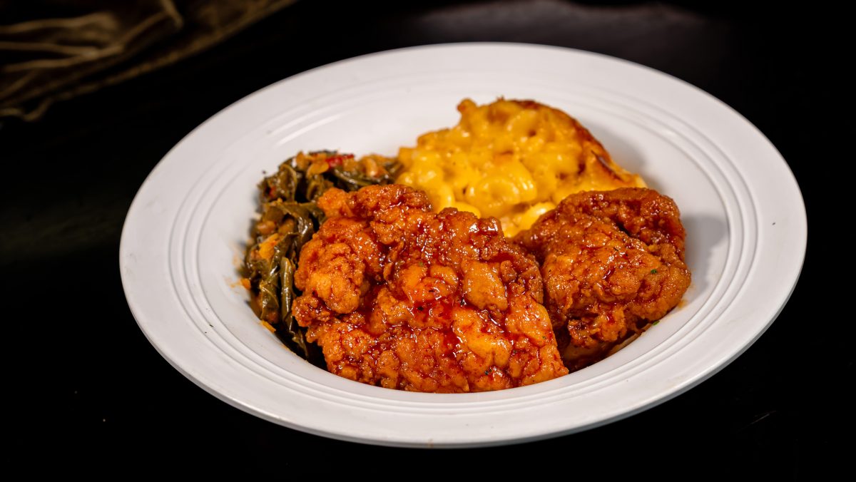 - French Quarter Fried Chicken Bowl – Spicy honey-glazed fried chicken with baked macaroni and cheese and collard greens