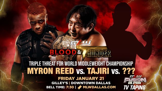 MLW today announced a Mystery World Middleweight 3-way featuring Tajiri (champion) vs. Myron Reed vs. a Mystery Entrant for Friday, January 21 at MLW Blood & Thunder at Gilley’s in Dallas, featuring an MLW Fusion TV taping.