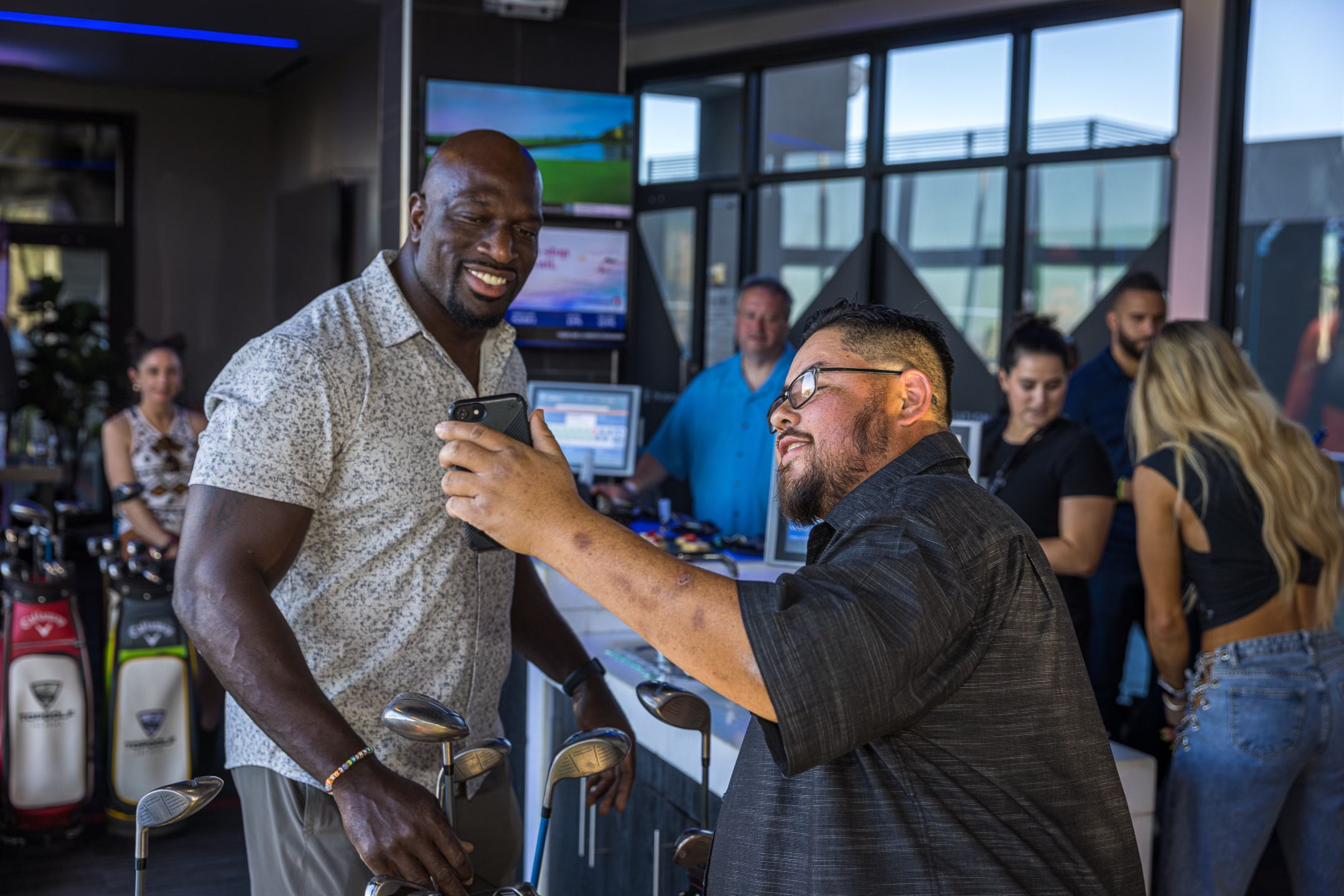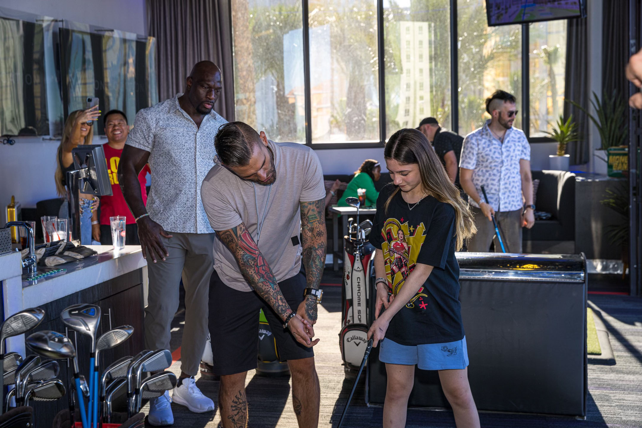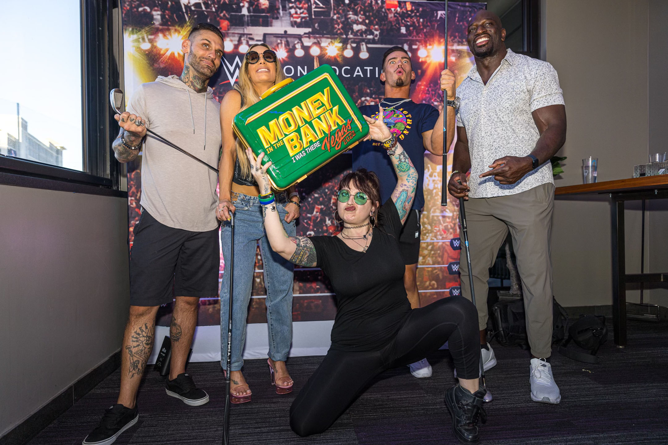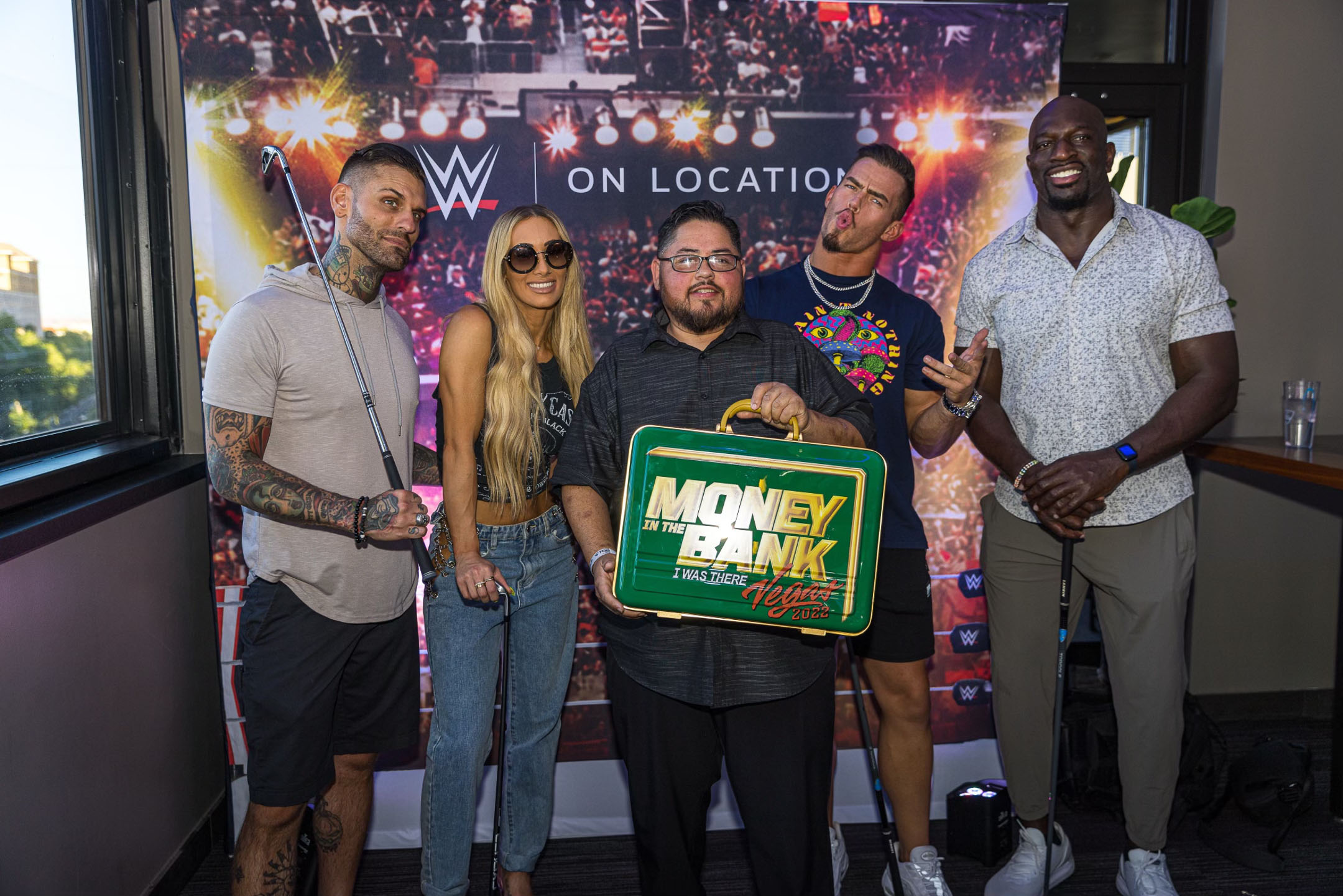 Leading up to WWE’s Money In the Bank Event tonight in Las Vegas, On Location, the official hospitality provider of WWE, hosted a star-studded event at Topgolf in Las Vegas. A group of 20 fans received the experience of a lifetime during an intimate, exclusive event at the Chairman’s Suite with premium food and bar service and one-on-one interaction with WWE Superstar Carmella, WWE Superstar and Raw announcer Corey Graves, WWE Global Ambassador Titus O’Neil, and current United States Champion Theory.